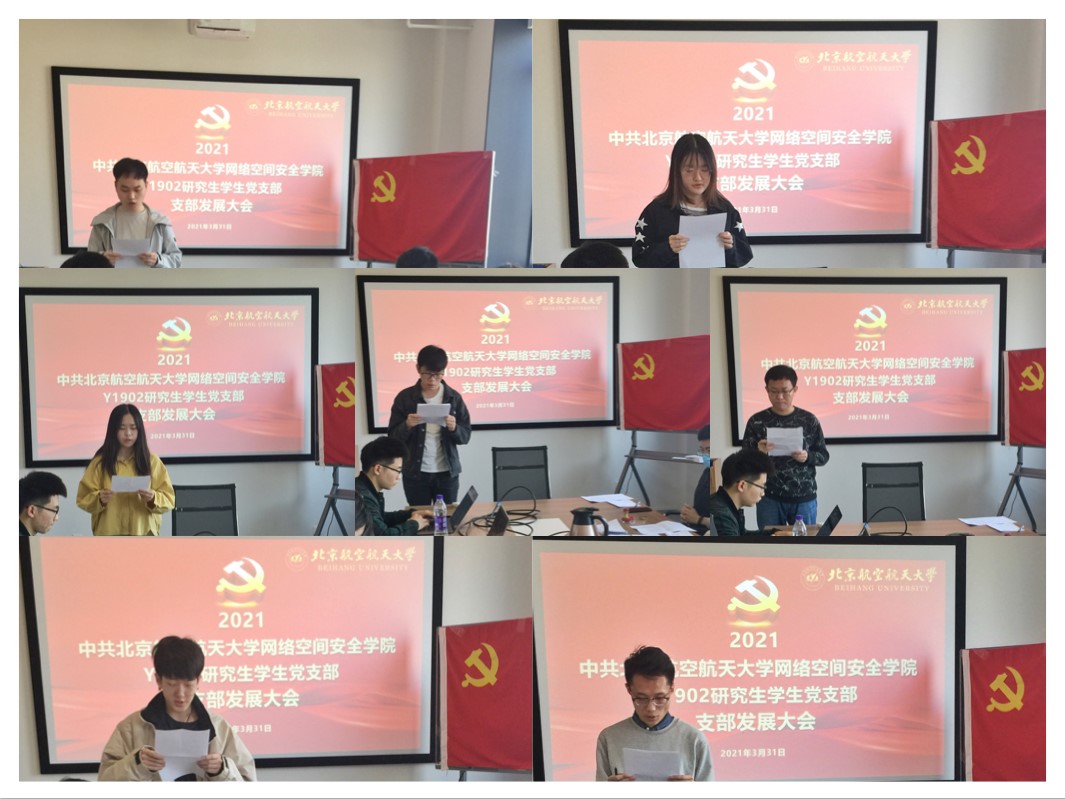 2021年3月31日上午10时,北航AC米兰中文官方网站Y1902学生党支部在一号馆408会议室召开支部党员发展大会,讨论能否接收曹银浩、韩祎然、刘翔宇、魏晨光、吴礼金、张伟豪、王庆麟7名同志为中共预备党员。本次大会由党支部书记陈晨主持,党建特邀组织员邓彦敏老师、专职组织员王倩云老师、专职辅导员杜逸雯老师列席本次会议。支部党员应到5人,实到5人。