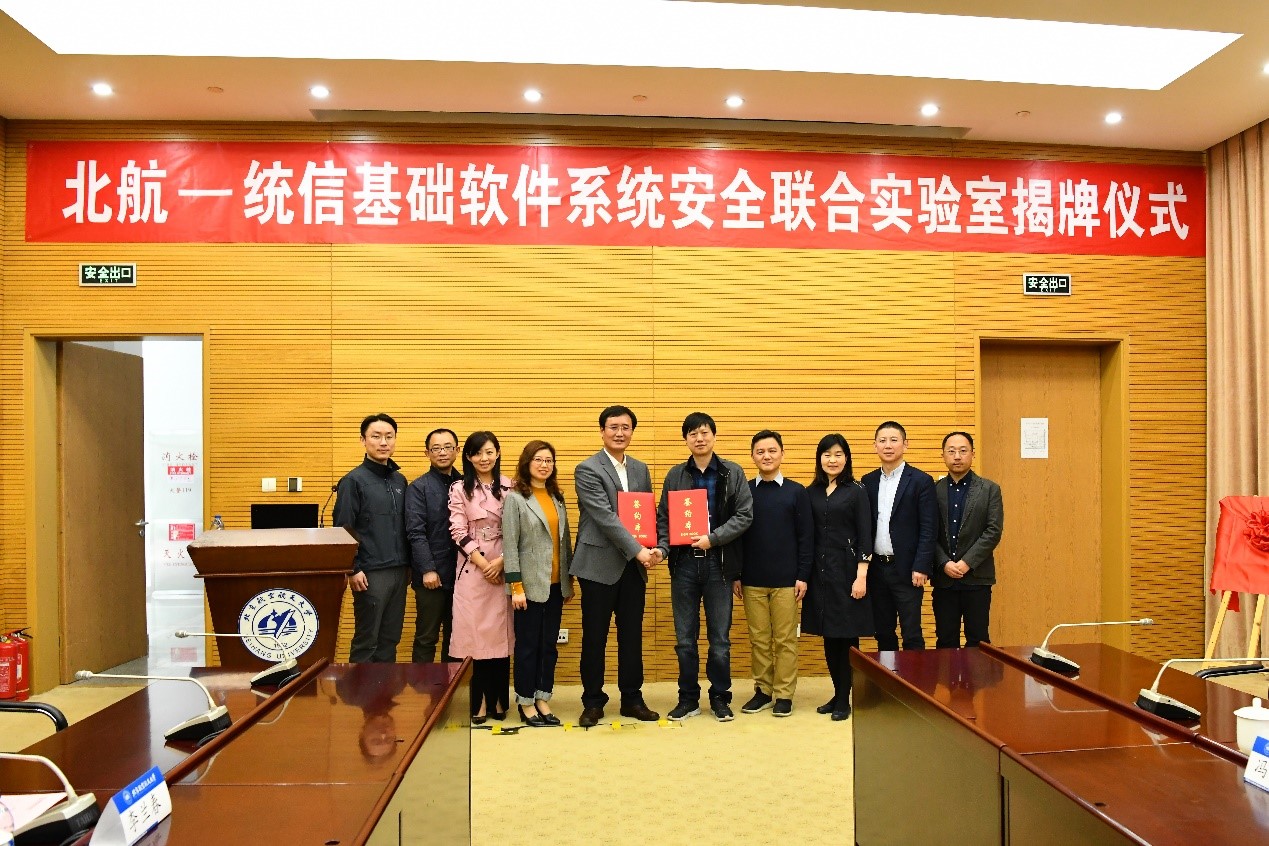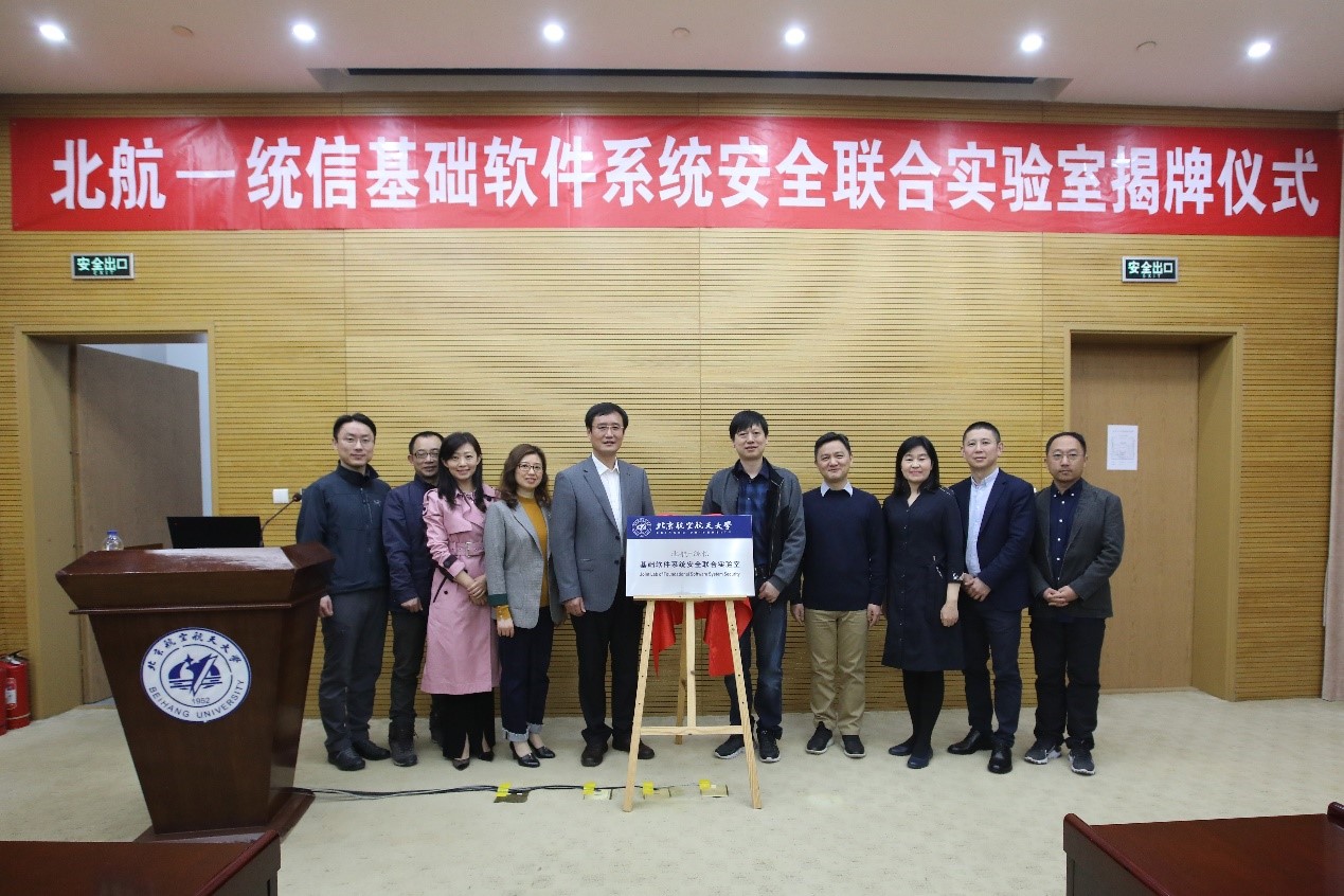 4月12日上午,AC米兰中文官方网站(简称:北航AC米兰中文官方网站)与统信软件技术有限公司(简称:统信软件)共建“北航—统信基础软件系统安全联合实验室”揭牌仪式在AC米兰中文官方网站成功举行。北航AC米兰中文官方网站院长刘建伟、党委书记蒋燕玲、副书记祝贺、副院长伍前红、副院长白琳、统信软件总经理刘闻欢、高级副总经理张磊、副总经理许可、副总经理令狐永兴、人力资源总经理武红伟等领导出席并见证本次揭牌仪式。