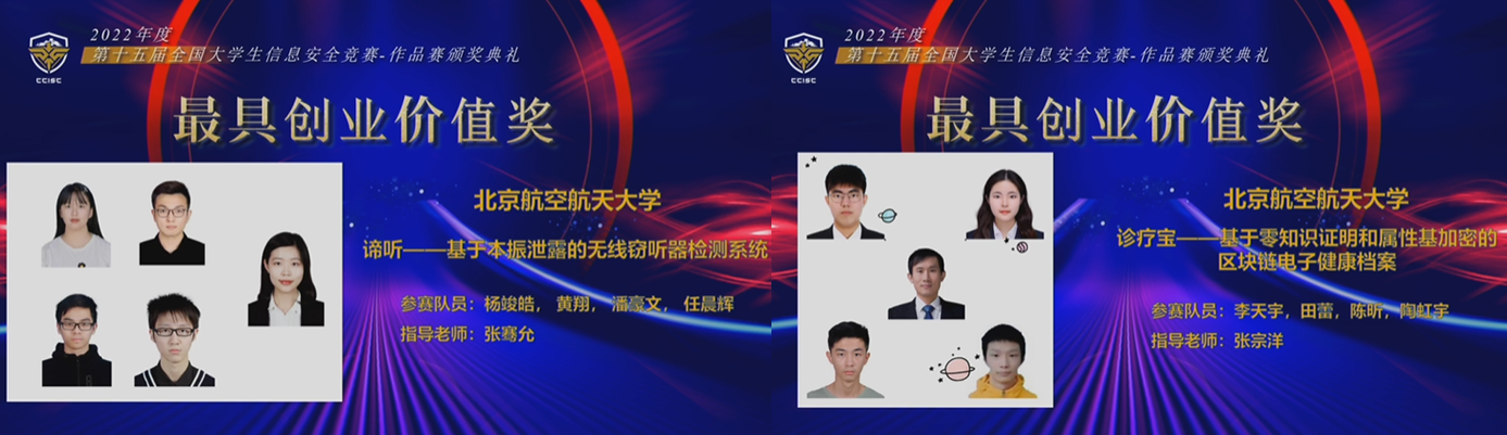 据悉,全国大学生信息安全竞赛自2008年起,已连续举办十五届,是我国级别最高、覆盖范围最广、影响力最大的大学生信息安全类竞赛,第十三届全国大学生信息安全竞赛作品赛由教育部高等学校网络空间安全专业教学指导委员会主办,AC米兰中文官方网站承办。本届作品赛由中国互联网发展基金会主办,湖南大学承办,经过初赛选拔,全国共有310支队伍晋级总决赛,决赛通过长沙主赛区和杭州分赛区开展,根据作品内容分为系统安全、安全检测、网络安全、应用安全/内容安全、数据安全等10个小组,各小组以视频答辩、匿名评审的方式进行,最终40支队伍获得一等奖,北航占了1/8,其中最具创业价值奖10项,北航占1/5,60支队伍获得二等奖,80支队伍获得三等奖。
