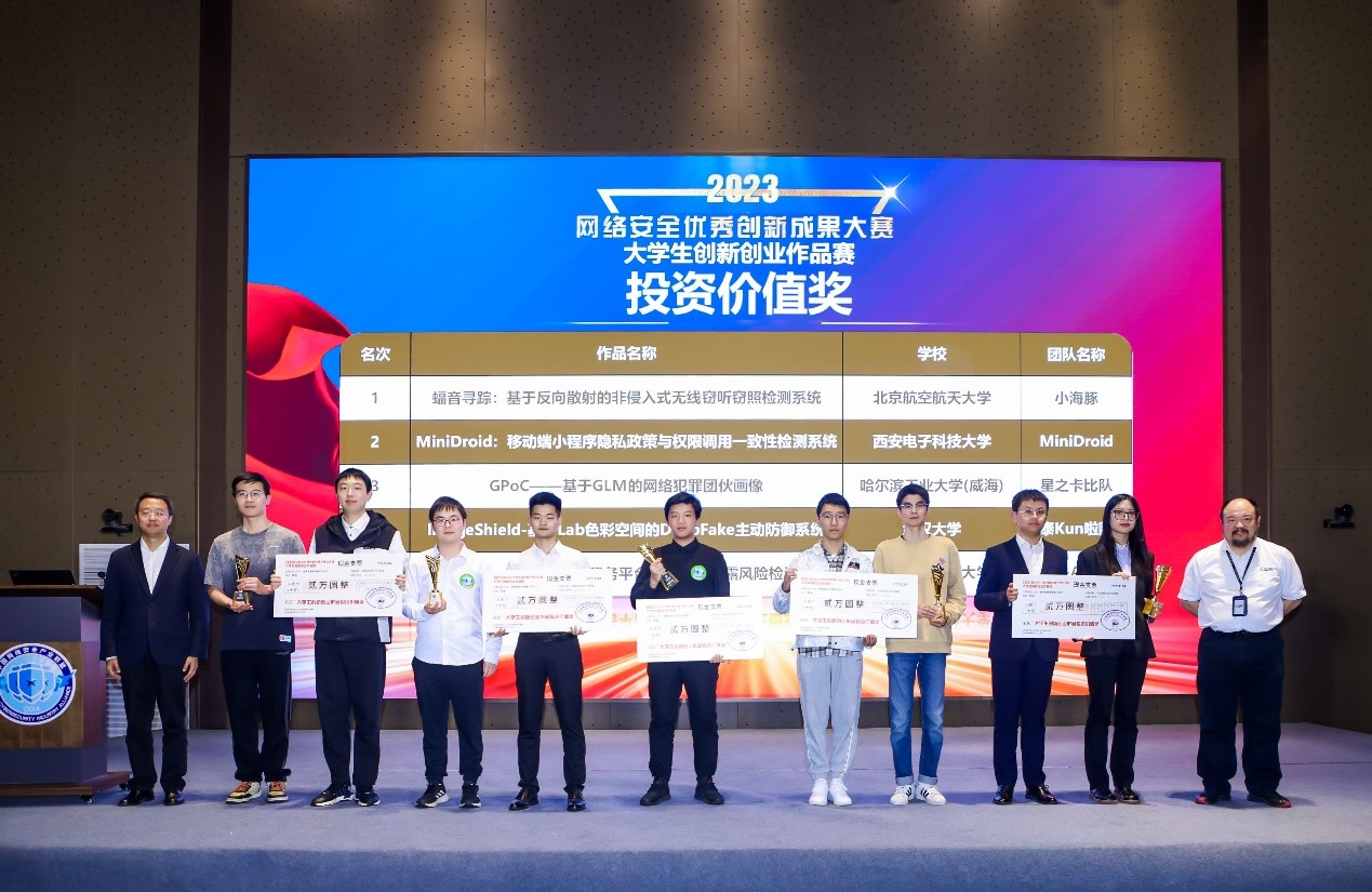 在2023年11月4日由中国网络安全产业联盟举办的网络安全优秀创新成果大赛中,网安学院本科生团队“小海豚”荣获大学生创新创业作品总冠军。这支由任晨辉、梁亮、寇竞、孙志成四名本科生组成的团队,在张骞允老师的指导下于2022年8月搭建了第一代原型系统,先后获第十五届全国大学生信息安全竞赛一等奖、最具创业价值奖,以及2022年网络安全优秀创新成果大赛大学生创新创业作品总冠军。但他们并不止步于此,一次次将模型推翻重建,反复进行实验测量,最终于2023年8月完成了二代作品的迭代升级,相继斩获了第十六届全国大学生信息安全竞赛一等奖、最具创业价值奖,并以总评第一的成绩再次获得2023年网络安全优秀创新成果大赛大学生创新创业作品总冠军。