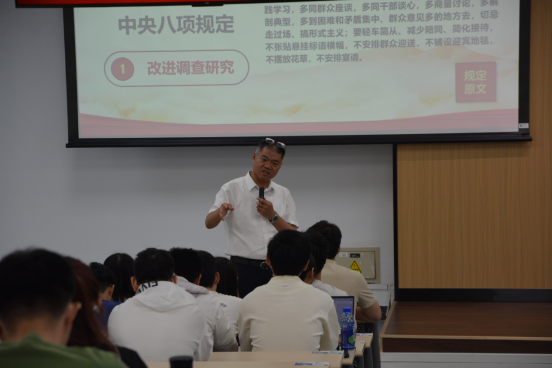 在会议的第一项议程中,学院院长罗洪斌同志为全体党员讲授了八项规定专题党课。本次党课以“深入学习中央八项规定精神”为主题,从多个维度进行了深刻解读。罗洪斌同志详细讲解了中央八项规定的主要内容,包括改进调查研究、精简会议活动、精简文件简报、规范出访活动、改进警卫工作、改进新闻报道、严格文稿发表和厉行勤俭节约等八个方面。他指出,中央八项规定精神是全党同志的共同要求,体现了以上率下的精神,是符合中央八项规定内涵的一系列政策规定的统称,每一名党员都应当严格遵守。罗院长还通过一系列详实的数据,进一步深入解读了八项规定的重要意义和实践价值,强调中央八项规定是新时代共产党人的一张“金色名片”。全体党员在党课学习中认真聆听、积极思考,纷纷表示要将中央八项规定精神内化于心、外化于行,以实际行动践行党的优良作风。