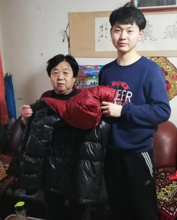 刘志鹏同学选择的是原来住在他家隔壁的一对老夫妇。这对老夫妇这些年一直在帮他们的儿子还债,年逾古稀,还住在租来的不足40平米房子里。在把御寒衣物交给这对老夫妇手中后,他们握住了刘志鹏同学的手。