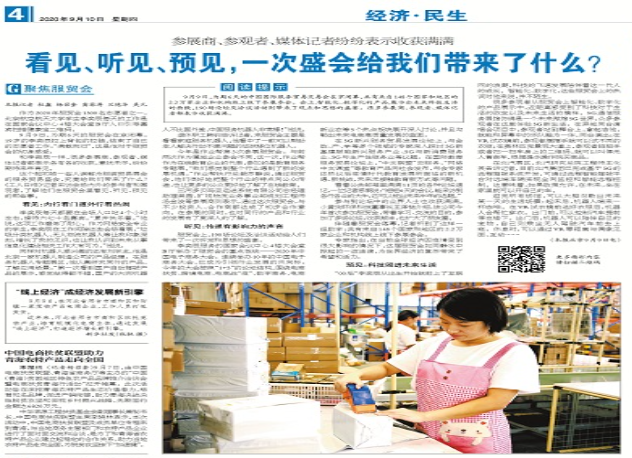 李奕辰服务的国家会议中心4楼大会堂B厅举办了服贸会的重点板块——2020年中国电子商务大会。这个连续举办10年的大会,已成为引领行业发展的风向标。今年的大会按照“1+5”的论坛结构,围绕电商扶贫、跨境电商、电商战“疫”、数字商务、电商新业态等5个热点板块展开深入讨论,并且勾勒出未来电商高质量发展的蓝图。