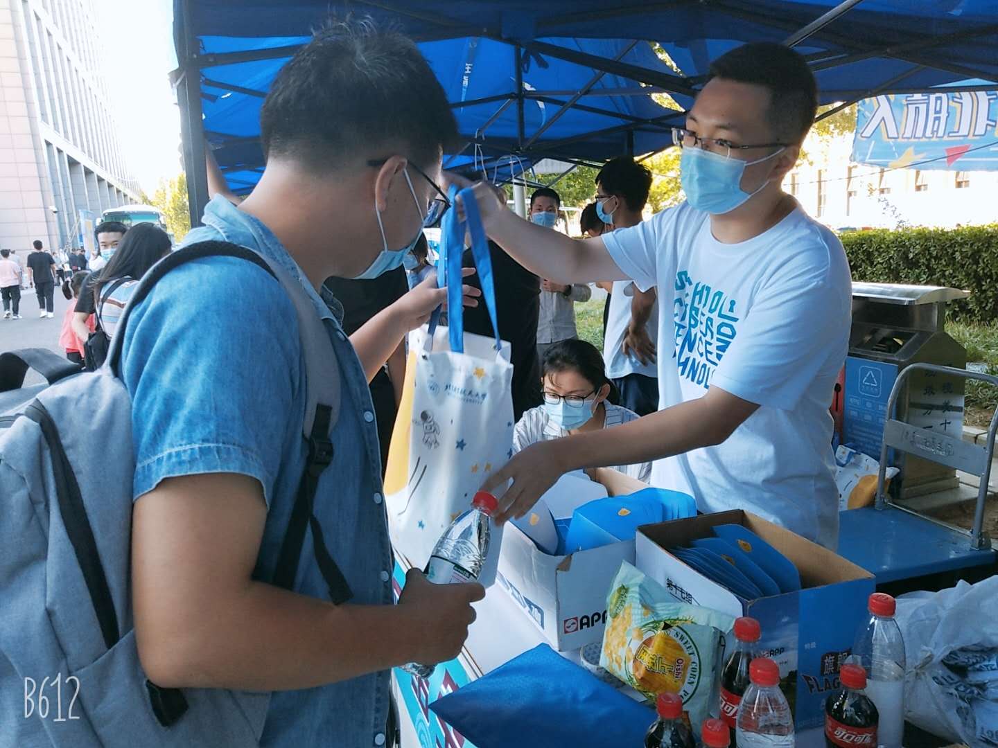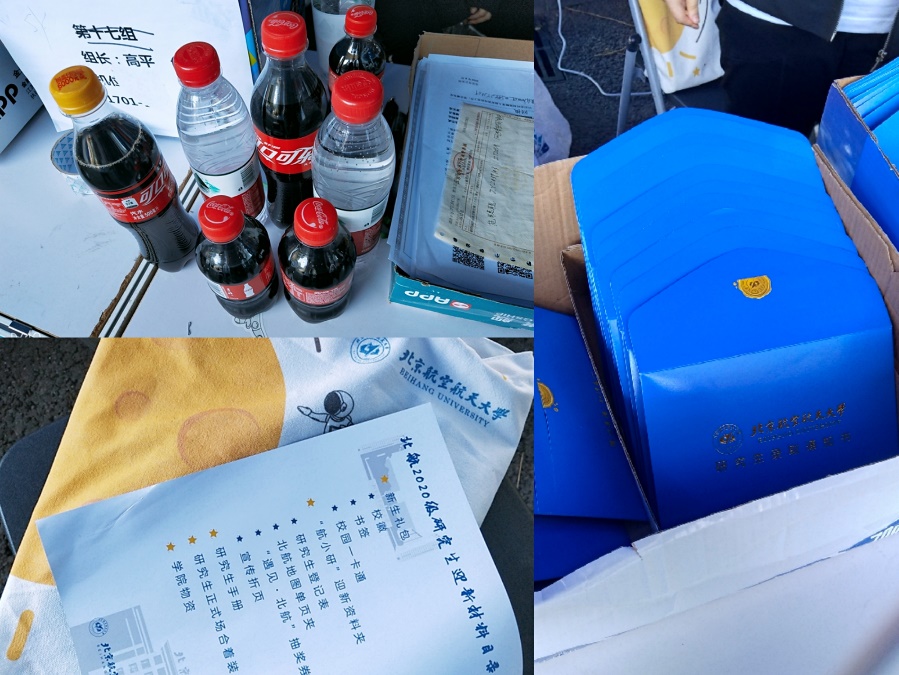 新生到达学院迎新区域后会向迎新人员出示他们的证件,随后获得已经整理好的新生大礼包。大礼包中包含校园一卡通、院服、校徽等各种必需品、纪念品。考虑到新生们长途跋涉后的疲累,迎新团队非常贴心地准备了水和饮料供新生们饮用。