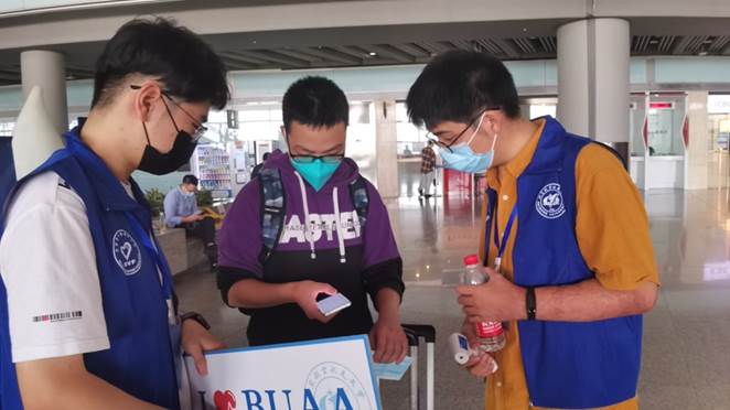 随着疫情防控常态化,为了更好地保障北航师生的安全,在到达等待区后,志愿者为新生测量体温,用消毒液进行消毒,更换新的口罩。最后查验返航通行证绿码,北京健康宝绿码以及录取通知书确认身份。接下来,只剩下等待班车的到来,就可以到达最终的目的地。